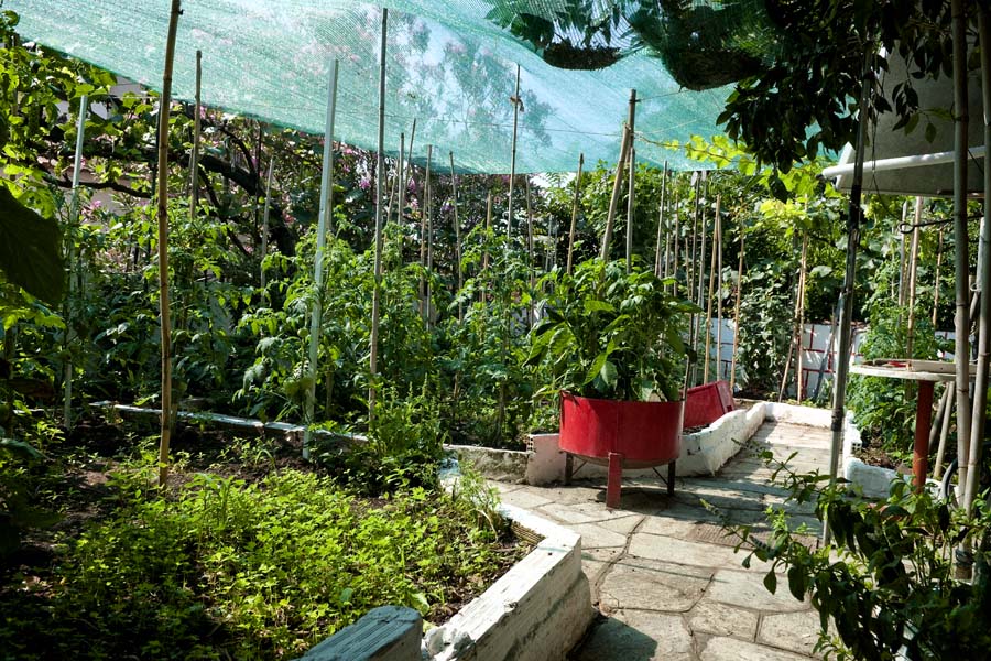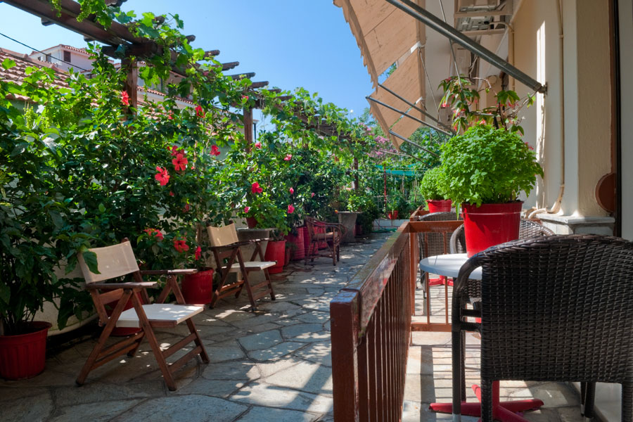 Μια ποικιλία από λουλούδια, όλα φροντισμένα μετο μεράκι της κυρίας Κούλας σας καλοσωρίζουν μόλις περάσετε στην αυλή του ξενοδοχείου. Θα βρείτε ακόμα ένα παραδοσιακό μπαξέ με όλα τα λαχανικά της εποχής.
